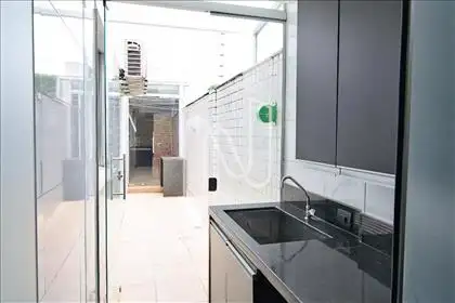 A sala ampla para 3 ambientes, com painel planejado, lustre e varanda com pergolado de vidro, integra-se perfeitamente à cozinha americana montada com armários, coifa e forno embutidos. Conta ainda com escritório planejado, lavanderia e dependência completa de empregada.